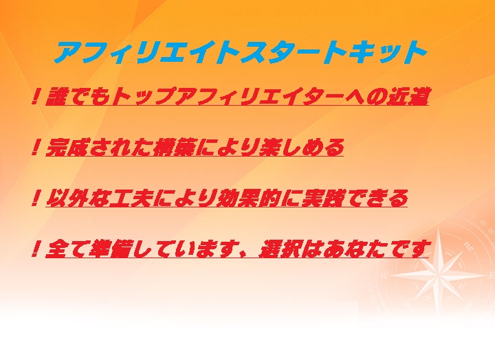 ![]() このプログラムを開始するにあたり、自分自身もいろいろ学ばせていただきました。 プログラムを開始する経緯を少しだけ話させてください。 ※長文ゆえ、内容をいち早く知りたい方は、「ここからが本題・・」まで飛ばしてください。 2009年にパチンコに嵌り、社会的地位を落としてしまった友人がいました。 職場が一緒のこともあり、日に日に絶望的になる友人を目の前に自分としては、 正直どうすることもできず、心の中では「自業自得ではないか」という客観的な 視点でずっと見てました。 しかし、友人は自分にしか相談をしてきません。 自分としては、ギャンブル自体やらないので、「そんなに負けてるなら、辞める 努力をしてはどうか?」としか言えず、友人もその言葉に対して、辞めれないから 話してるんだ・・・と、いつも平行線が続く中、友人と一緒にパチンコ店に通っていた Bさんが、自分をパチンコ店へ誘ってきました。 もちろん友人も一緒です。 ここから自分の考えが少し変わり、悩み苦しんでる友人がどのようなものに 嵌って、大金を損ねているのか。実際に覗きに行くことにしたのです。 そこで、自分はBさんに教えてもらいながら、ミドルスペックの台を打ってみました。 5千円ほど使い込んだ時に、大当たりし、2時間ほど一切落ちることなく、24連荘 しました。 俗にいうビギナーズラックというものでしょうか。 そこでいきなり6桁の大金を 得てしまい、素直に喜びましたね。 しかし、友人とBさんは2万ずつ負けており、 「今日はまだいいほうだな、あいつに晩飯ご馳走になろうぜ」という流れに。 その日は当然、自分が晩御飯をファミレスでおごる形になり、友人とBさんが 話してる内容に耳を傾けると、パチンコ以外の話がないんです。 確かにパチンコ店に行った後ですから、当然かもしれませんが、次の日も 職場でパチンコの話が尽きず、延々と話してました。 そこで、気づいたんです。 友人が自分にしか相談してこなかった理由が、自分がギャンブルをやらないから ということだったのです。 そう、友人の周りにはパチンカーばかりだった為に、 自分が羨ましかった。ということが後になって理解し、心を痛めました。 自分は大金を得ましたが、妻子持ちであり、妻が厳しい為、二度とパチンコ店に 行かぬよう自分を縛り付けていた為に、それ以降嵌ることはありませんでした。 しかし、正直簡単に大金を得てしまっては、その金から3万くらいで、またプラスに なるのではないか?などと、錯覚しました。 なので、妻が縛っていなければ、自分も同じ道を行ってたかもしれません。 ただ、友人の事が気がかりであり、通い続けてはないものの、なんとなく 嵌っていく理屈が見えました。 そこから、個人的にいろいろ業界のことや 店の内情、表と裏を少しずつ調べ、本を買いあさり、蓋を開けてみれば、どう 頑張ったって、業界側が商売として成り立たすためには、客が負けなければ 行けない仕組みであり、絶妙かつ巧妙に客の財布からうまく抜いている。 ということが見えてきました。 ある程度理解した上で、友人にパチンコの怖さを話しましたが、なんと、 「ああ、そのくらいのことなら自分も知ってるよ」という返答・・・。 え??? ならば、なぜ故???頭が混乱しました。 理解した上でやっている? すなわち、承知の上で勝負をしている。と言うのです。 これはこれは、自分の無知が裏目にでたのか・・・。そこで第二の心の痛みが 自分を襲いました。 でも、この痛みのおかげで、もう少し工夫するべきだったと考えました。 それがこのスタートキットの始まりであり、友人も救うことができました。 上記はパチンコを題材にしていますが、それがなければこのキットも 存在していなかったので、実例を載せています。 ここからが本題となります スタートキットとはいえ、購入者が何もせずとも儲けるツールではありません。 かといって、特殊な能力や知識等はほとんど必要ありません。 いわば、「やる気があれば、誰でも結果として返ってくる」仕組みを案内してます。 努力した結果は「報酬」として、返ってくるスタートキットです。 簡単な条件として、以下の内容を一読してください 今までのアフィリとは何か異なるんですか? 厳密には、アフィリエイトとは少し異なります ・商材アフィリ 内容:ブログとHPとを作成し、企業と提携して 条件を満たせば報酬を得られる ・メルマガアフィリ 内容:メルマガを利用し、読者を増やしある程度信頼 を得た段階でユーザーを自サイトへ誘導し、 読者により商材を購入していただく ・ポイントアフィリ 内容:ポイント系サイトへ登録し、紹介等して報酬を得る ・転売アフィリ 内容:情報をまんま転売する。また、商材をアフィリエイトし 内容を一緒に宣伝し、報酬を得る。 情報商材検証サイトやその他 ・海外サイト 内容:海外サイトへ登録し、アフィリエイトを行う 上記は既に出回っている情報ですが、まさかこれ